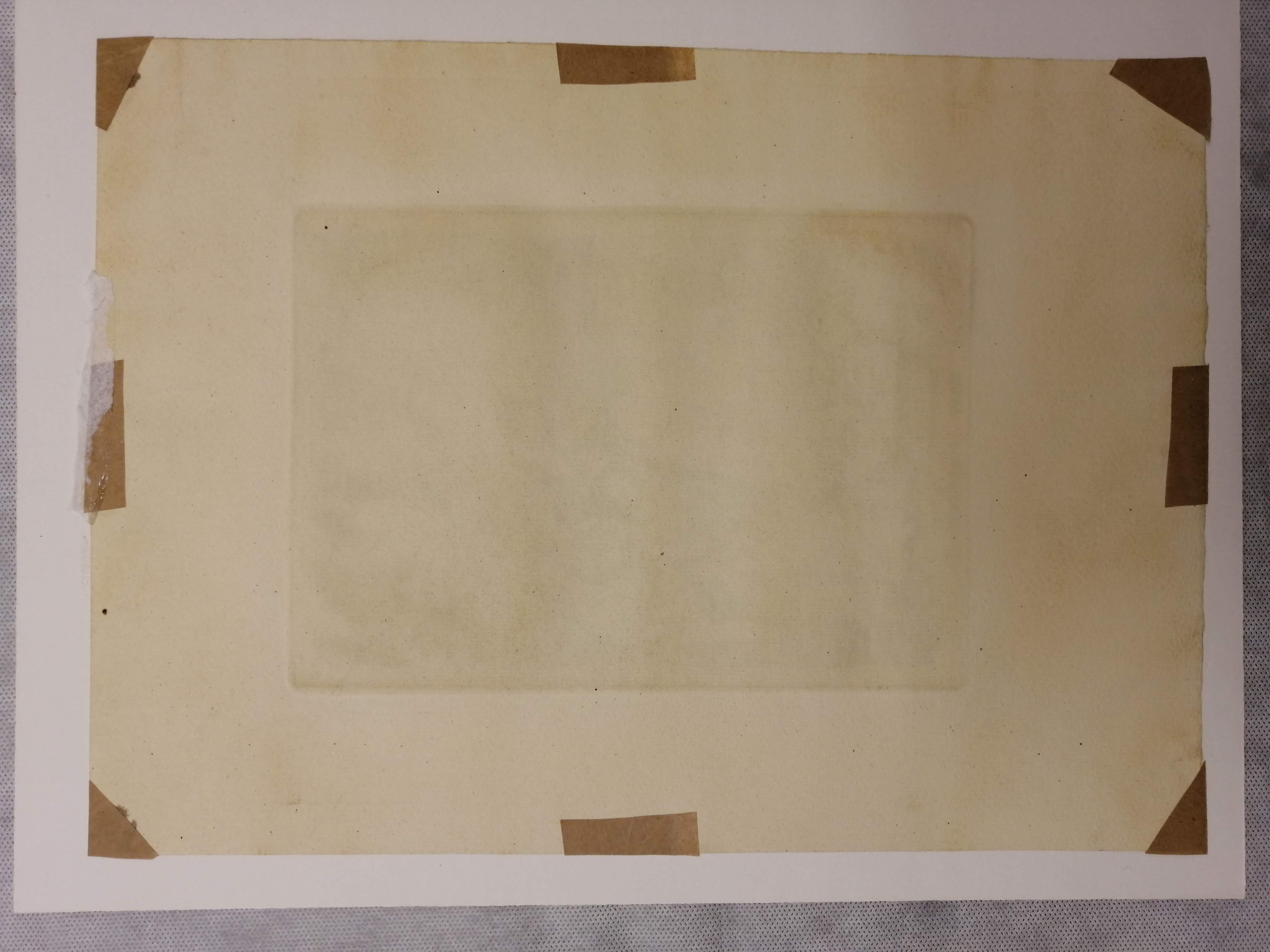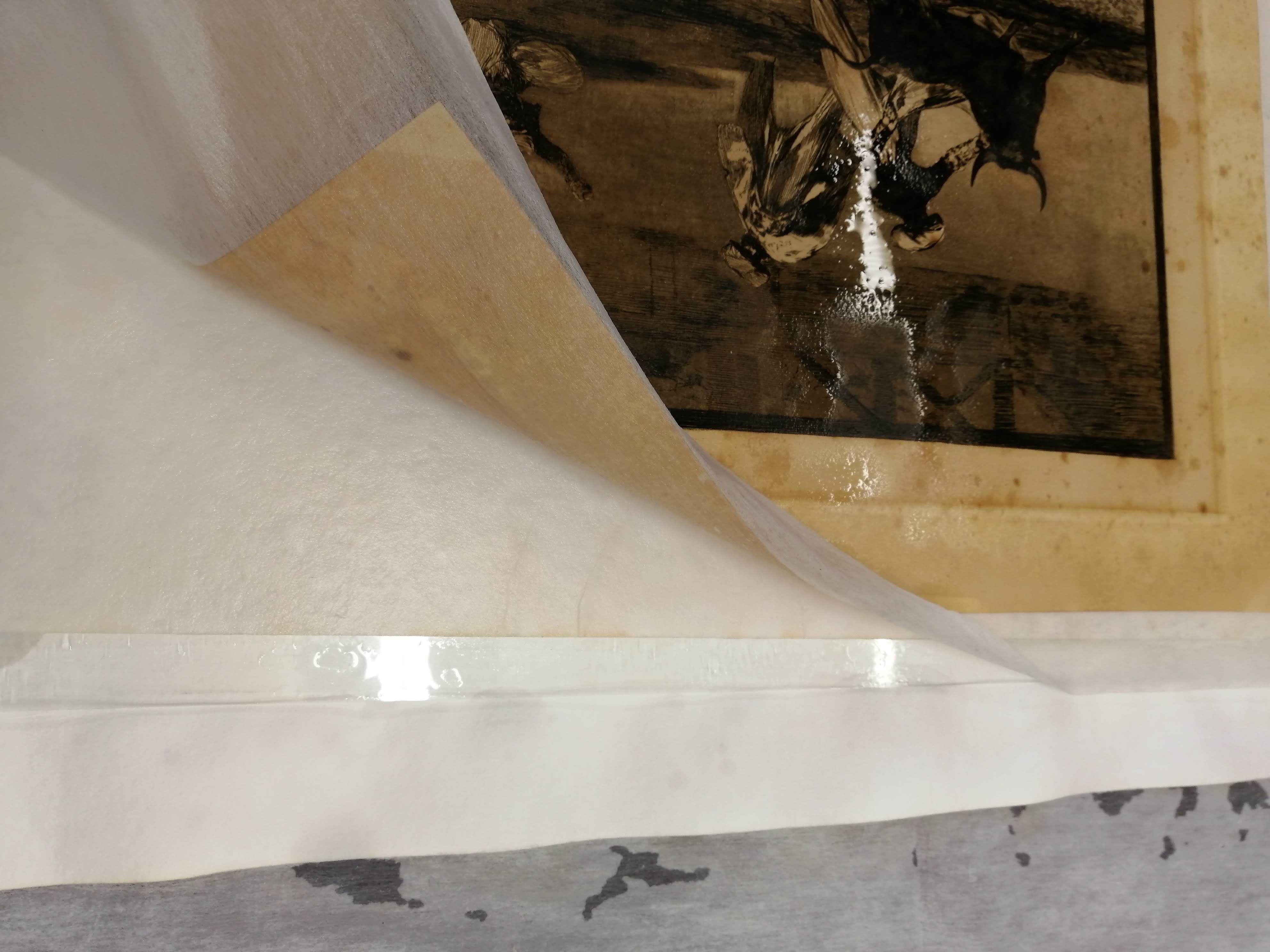 La restauración ha ido por fases, primero hemos procedido a la una limpieza de todos los grabados, en seco y con pincel. En segundo lugar, hemos eliminado los restos de celos y gomas que se habían utilizado para fijar los grabados a los passepartout. Seguidamente se ha procedido a la limpieza en húmedo, utilizando un sistema de limpieza por capilaridad.